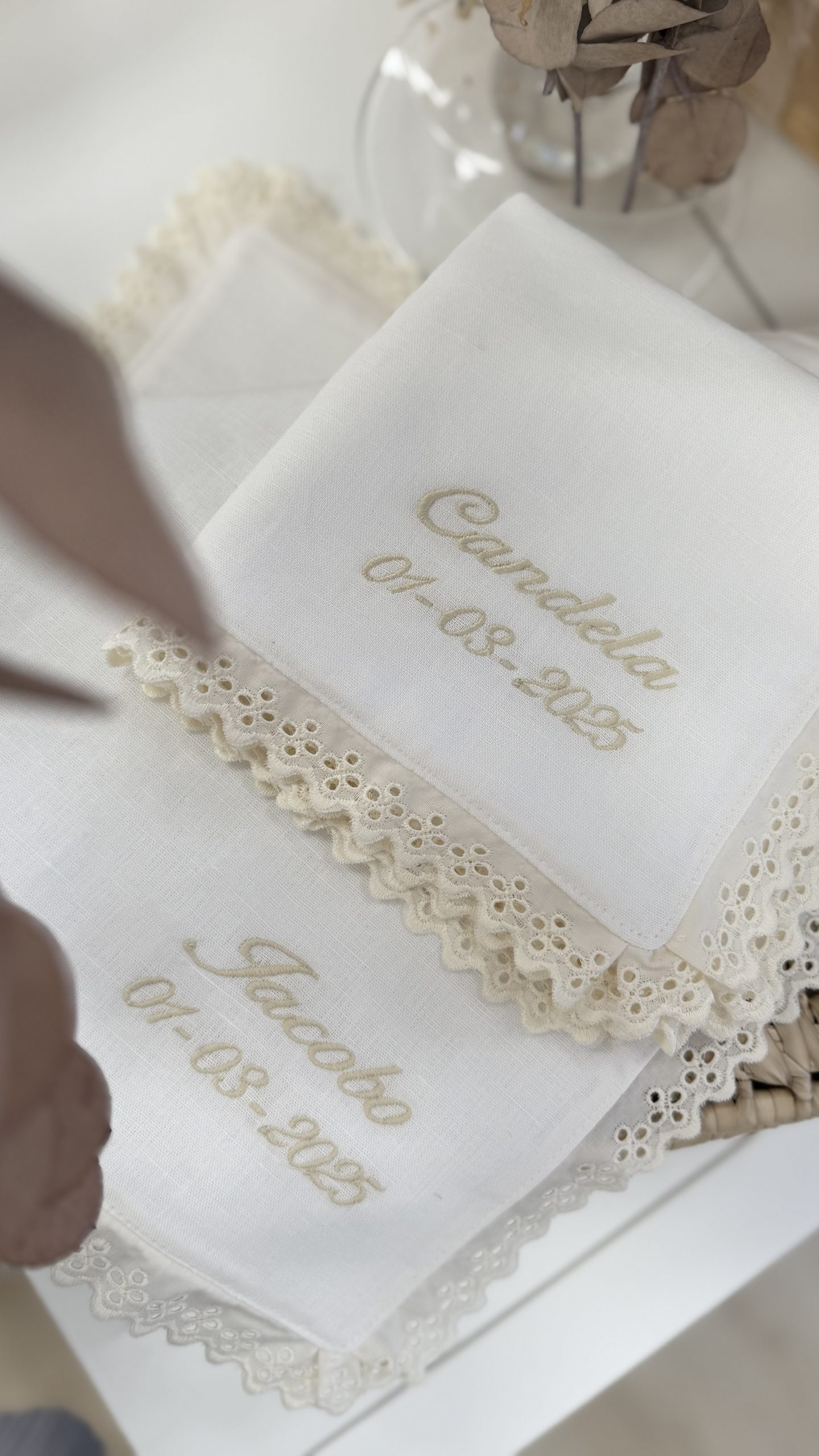 Pañuelo de Bautismo. Pañuelo para un día muy especial…son cuadrados, de lino de algodón 100% y con rizo de toalla de bambú en su interior. Se pueden personalizar con puntilla alrededor y como no, bordamos lo que más te apetezca en ellos. Nos parece una idea muy bonita para hacer a vuestros peques en un día tan especial o para regalar! Recuerda especificar en Observaciones el nombre del bebé y la fecha del evento.